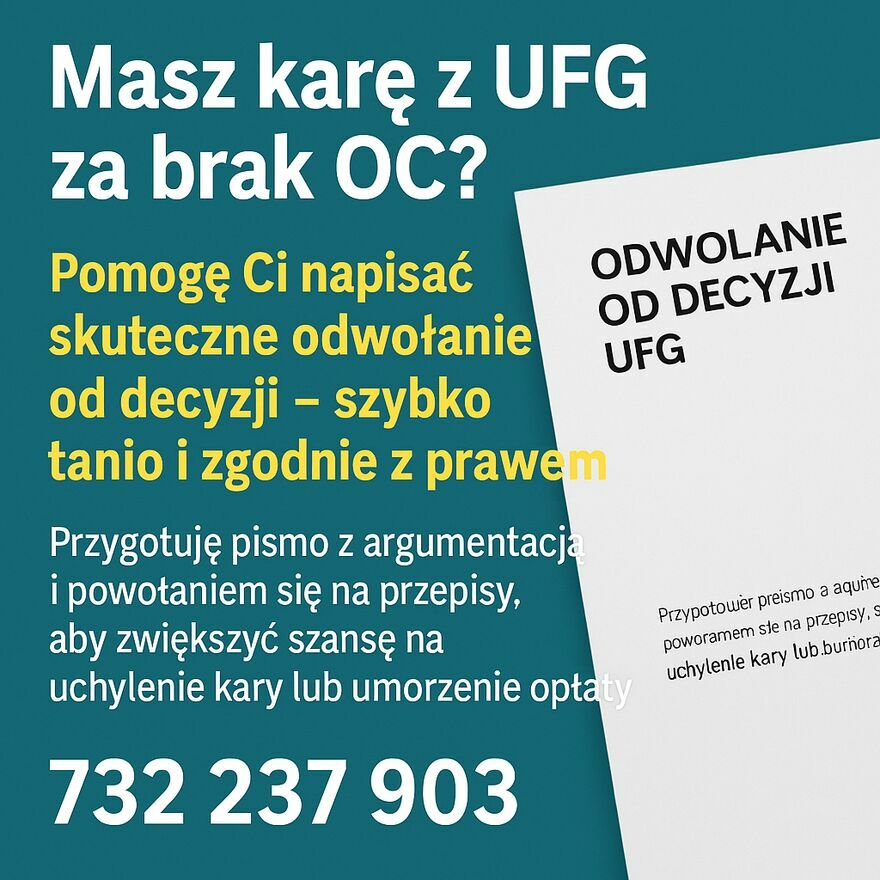 Masz karę z UFG za brak OC?Napiszę za Ciebie skuteczne odwołanie – szybko, tanio i zgodnie z prawem.